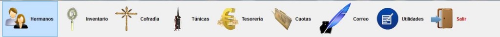 El programa en su nueva versión se estructura en los siguientes módulos: Hermanos, Inventario, Cofradía, Túnicas, Tesorería, Cuotas, Correo y Utilidades.