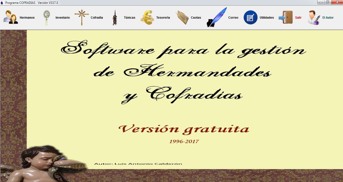 El programa Cofradías es un software diseñado especialmente para controlar la gestión de una Hermandad y facilitar la organización para la salida procesional. La aplicación COFRADIAS nos va a permitir controlar todos los aspectos administrativos relacionados con una Hermandad como por ejemplo dar de alta a un nuevo hermano, dar de baja a un hermano existente, consultas para una rápida localización de un dato concreto, más de 120 tipos de listados, registro de documentación, control de los ingresos y gastos de la Hermandad, impresión de los recibos de cuotas de cada hermano, registro de inventario, romería, pirámide de población, carnet de hermano, papeletas de sitio, control de túnicas y préstamos, correo electrónico, envío de cartas, control de No Hermanos, archivo, costaleros, tesorería, direcciones de interés, loterías, etc.