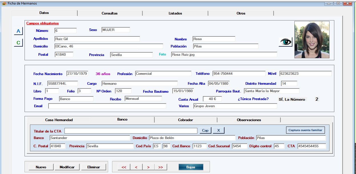 Gestiona todos los datos imprescindibles de los hermanos: domicilio, población, forma de pago, fecha de nacimiento, NIF, etc.