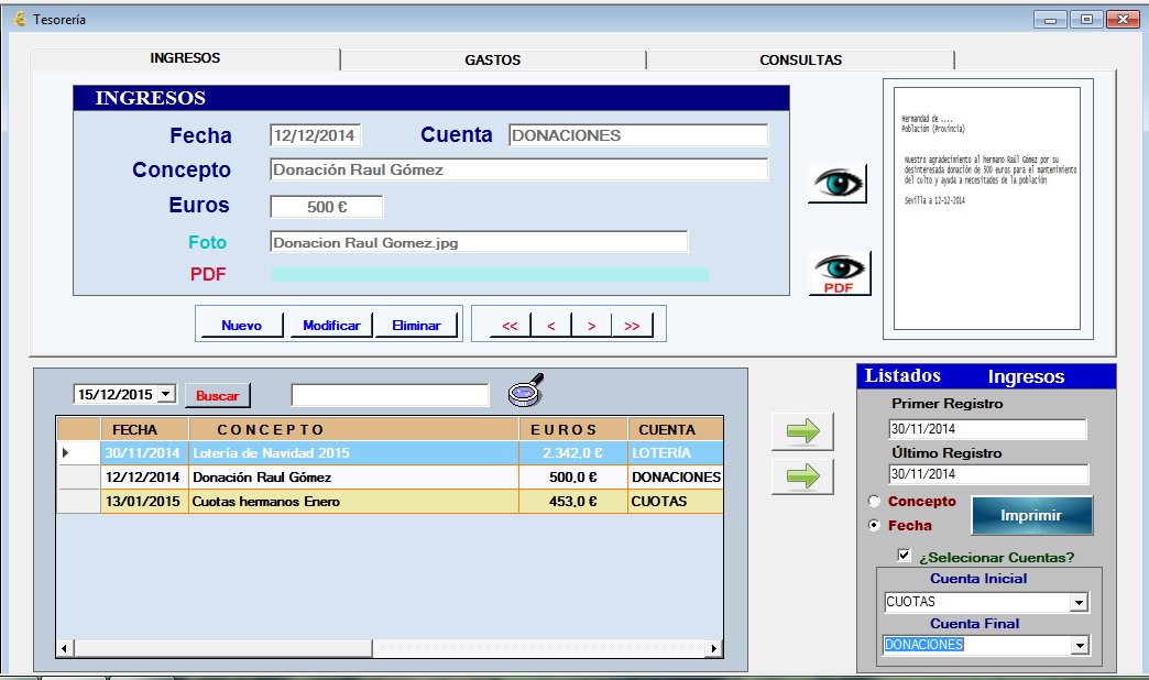 Básico control de ingresos y gastos con la posibilidad de tener el documento escaneado o incluso acceder al mismo en pdf.