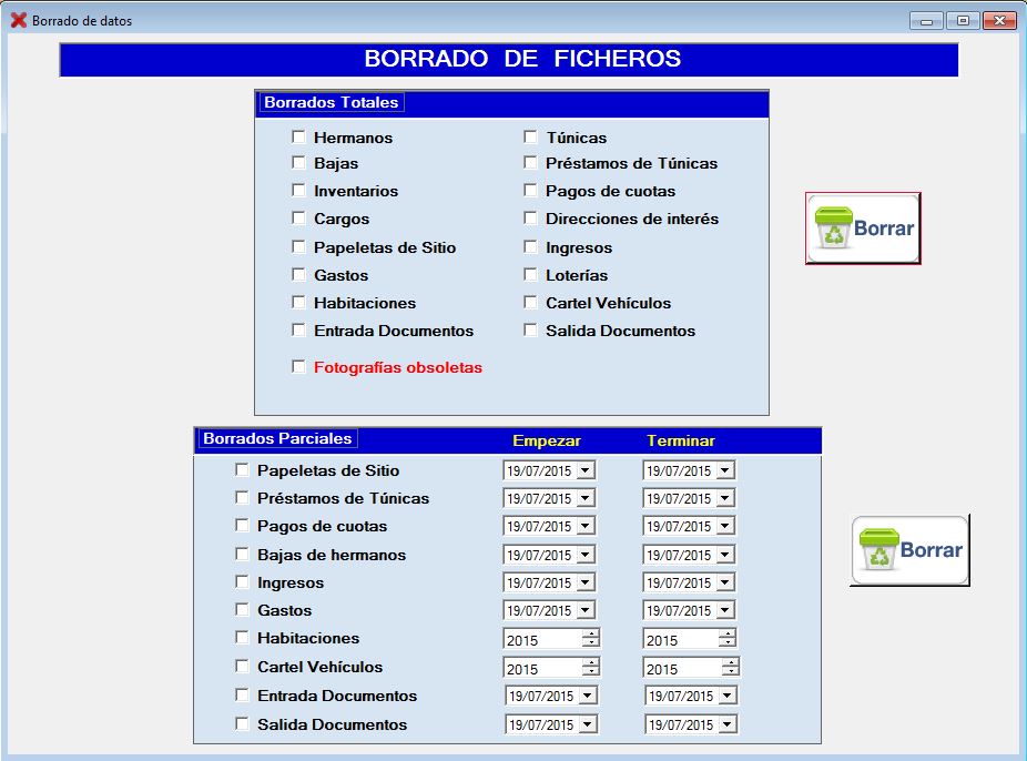 - BORRADO DE FICHEROS: Borra las bases de datos de forma total o solo una parte de ella.