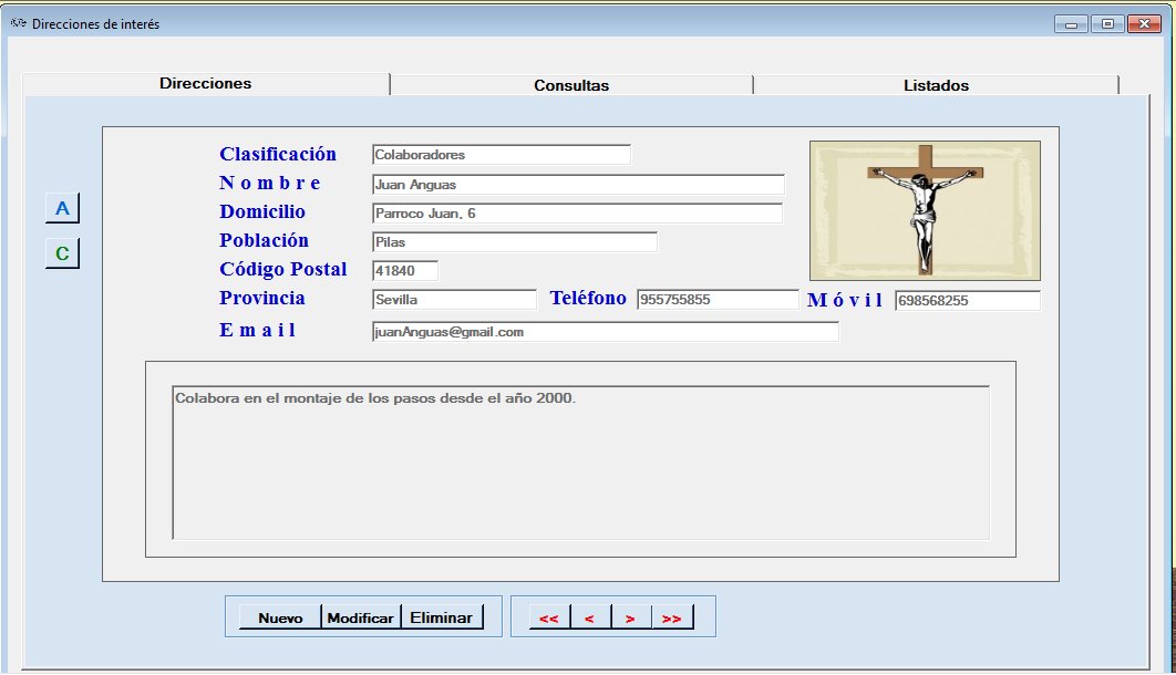 - DIRECCIONES DE INTERÉS: Permite tener las direcciones, teléfonos, etc de otras hermandades, colaboradores, electricistas, etc. Es una base de datos de direcciones de todo lo que no sean hermanos.