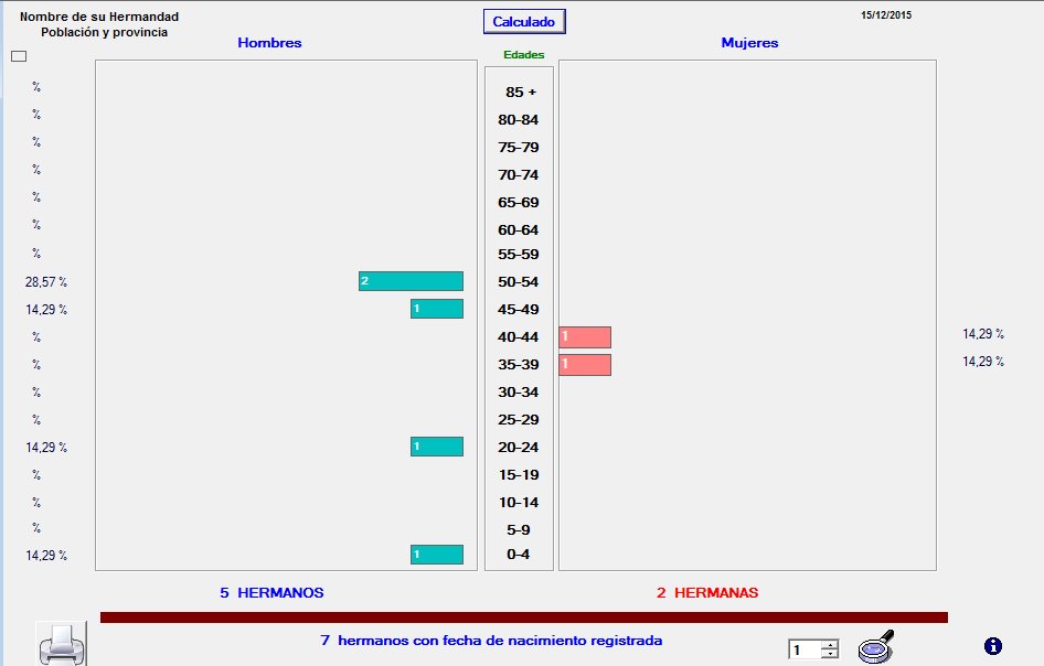 - PIRÁMIDE DE POBLACIÓN: Aporta información visual del índice de envejecimiento o no de la hermandad. Aparecen los hombres y mujeres por tramos de edad son su porcentaje y número.