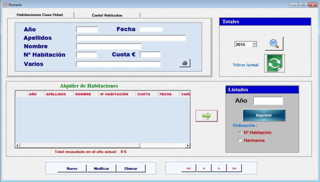 - ROMERÍA : Utilidad para controlar el alquiler de habitaciones en la Casa Hermandad y gestionar los carteles o número asignado a cada vehículo para que pueda transitar por los caminos de la romería.